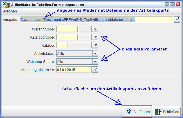 Jetzt erscheint der Dialog 'Artikeldaten im Tabellen-Format exportieren'. In der ersten Zeile sehen Sie noch einmal wo die Ausgabe gespeichert wird. Darunter all die Parameter, die wir in unserem Beispiel-Export angelegt haben.