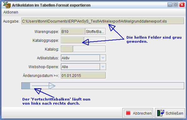 Ist der Export fertig, bleibt der Balken unten bestehen und die ergrauten Felder sind wieder hell geworden.