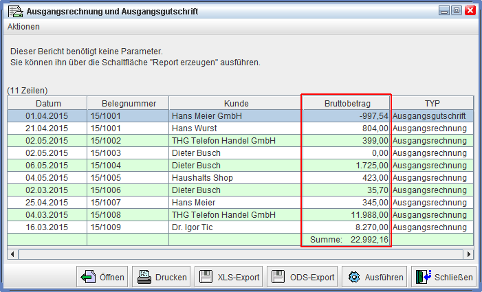 Nun gibt es die Möglichkeit, wenn wir als Beispiel eine Abfrage erstellen für Ausgangsrechnungen und Ausgangsgutschriften, die in einer Tabelle ausgegeben werden, das wir auch hier die Belege mit einem Doppelklick öffnen können, obwohl es sich um unterschiedliche Belegtypen handelt.