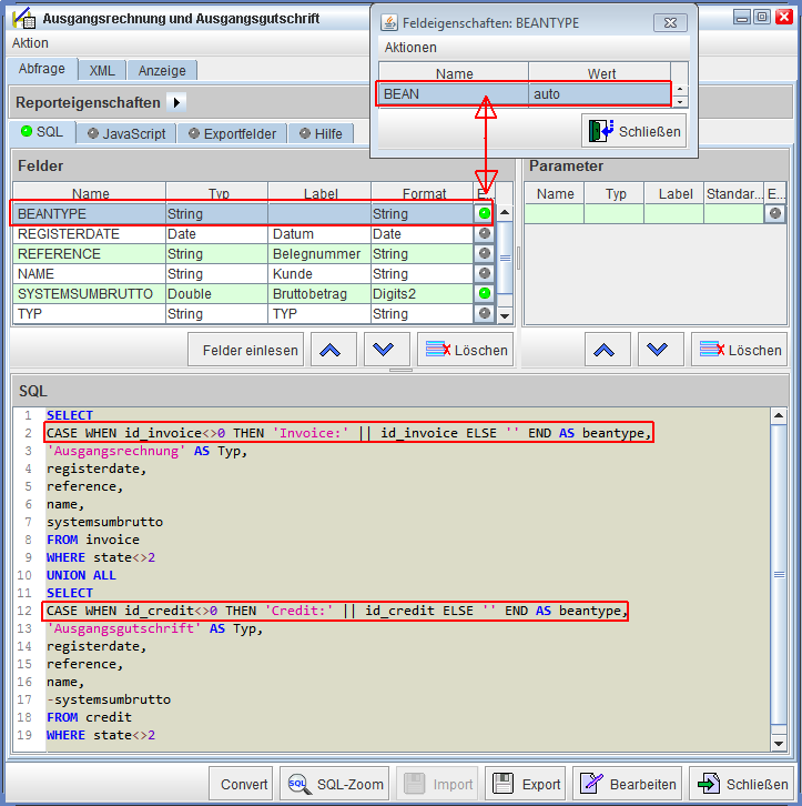 Das ist die 'id_invcoice' der Ausgangsrechnungen die als 'beantype' ausgeben wird: CASE WHEN id_invoice<>0 THEN 'Invoice:' || id_invoice ELSE '' END AS beantype,
