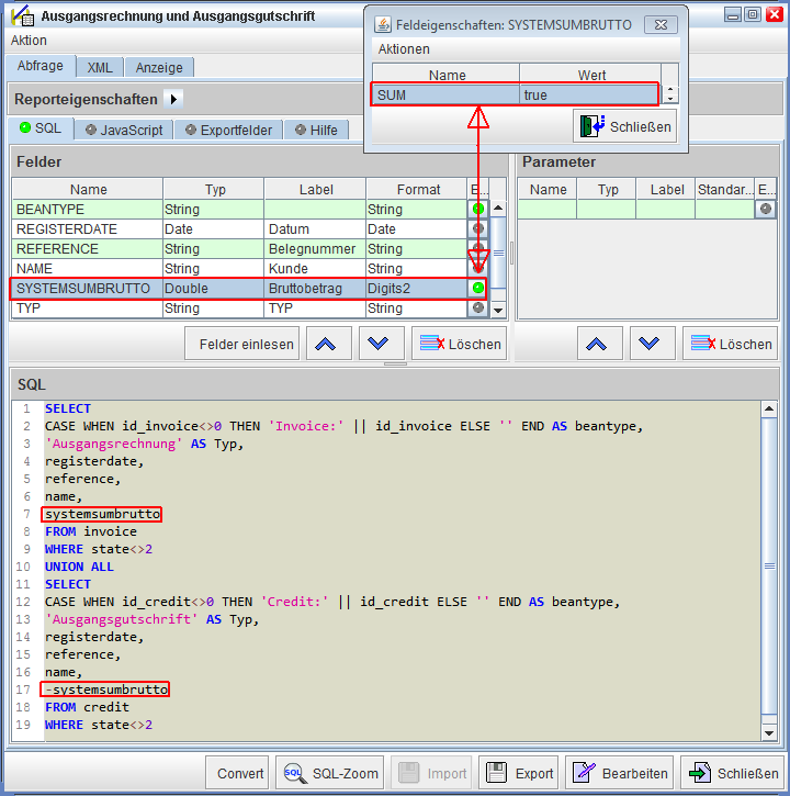 die wir alle als Feldeigenschaft hinterlegen können. Um bei unserem Beispiel mit den Ausgangsrechnungen und Ausgangsgutschriften zu bleiben, haben wir dort bereits eine Summation als Feldeigenschaft hinterlegt in dem Feld 'systemsumbrutto' bei den Eigenschaften.