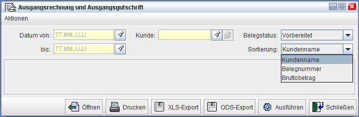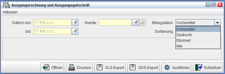 Mit einem Mausklick auf die Auswahlbox (Combobox) ist der Belegstatus jetzt wählbar und ist somit nun in der Lage nach den Belegen zu selektieren, die im Abfrageergebnis erscheinen sollen.