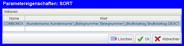 Die Form der Eingabe ist dann wie folgt vorzunehmen: {AnzeigeText1, 'Feldname1'}. Auch hier werden mehrere Werte durch ein Komma wieder getrennt und dann folgt der nächste Wert. Mit 'ASC' oder 'DESC' hinter dem Feldnamen kann man noch bestimmen, ob auf- oder absteigend sortiert werden soll. . Hinweis: Unter Parameter bei 'Typ' muss 'Stringbuilder' ausgewählt sein!