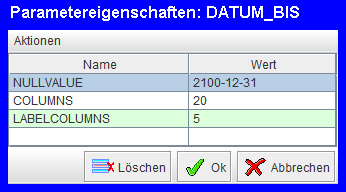Mit den Parametereigenschaften 'COLUMNS' und 'LABELCOLUMNS' wird das Erscheinungsbild des Parameters beeinflusst und zwar die Breite des Auswahl-/Eingabefeldes und die Breite der individuellen Beschriftung im Reporterzeugungsdialog.