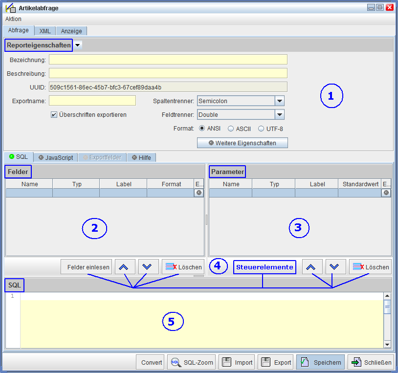 Der Reiter 'Abfrage' teilt sich in verschiedene Bereiche auf: