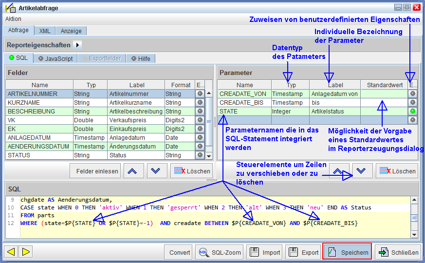 Für Sie bedeutet das: Jeder Eintrag in dem Bereich 'Parameter' repräsentiert später einen Parameter im Dialog mit Auswahl-/Eingabemöglichkeit zur Reporterzeugung. Das Erstellen einer neuen Zeile erfolgt analog zu dem Bereich 'Felder'.
