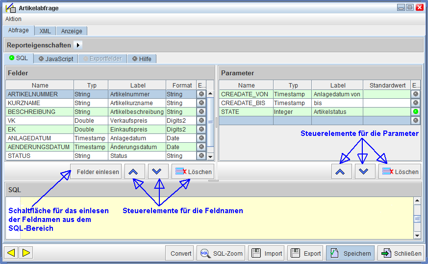 Mit dieser Schaltfläche werden nämlich die Spaltennamen aus dem SQL-Bereich in den Bereich 'Felder' eingelesen, um dort die Beschriftung und das Format zu erhalten, wie es gewünscht wird bzw. auch notwendig ist.