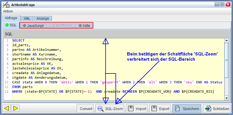 Hinweis: Wie Ihnen sicherlich schon aufgefallen ist, gibt es neben dem 'SQL-Reiter' noch weitere Reiter: 'JavaScript', 'Exportfelder' und 'Hilfe'.