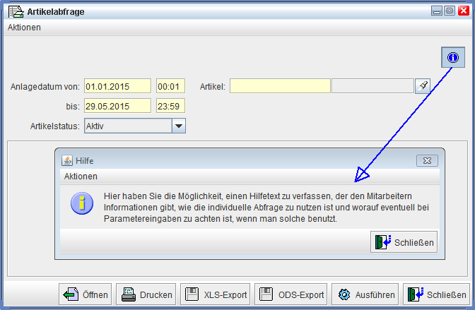 Wird dort nun ein Text hinterlegt, wird im späteren Reporterzeugungsdialog automatisch ein Info-Button eingeblendet, wo dann die Info abzurufen ist, wenn man mit der Maus darauf klickt.