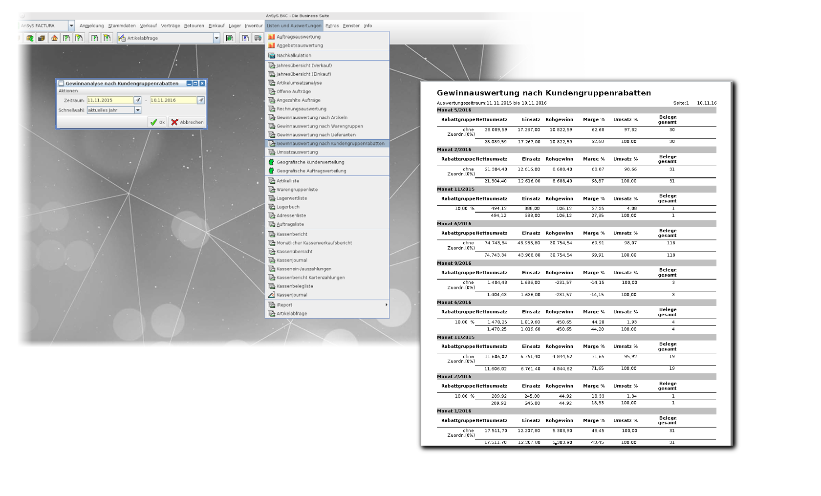Wenn Sie den Menüpunkt "Listen und Auswertungen" im FACTURA-, CRM- oder FIBU-Modul auswählen, finden Sie Punkte, welche von Anfang an im Programm integriert sind. Diese bieten Ihnen verschiedenste Möglichkeiten an Abfragen und Auswertungen, welche Sie nutzen können.