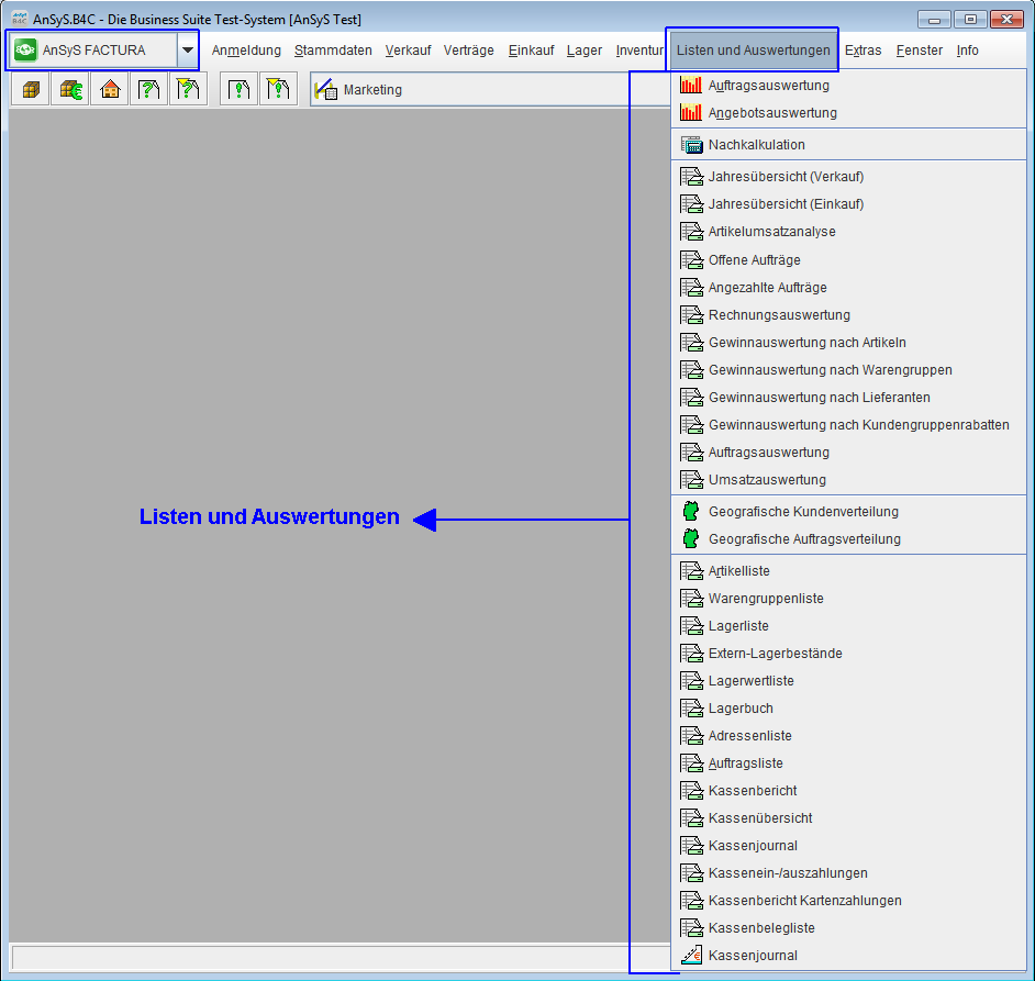 Folgend sehen Sie nun, welche Abfragemöglichkeiten Sie im Menüpunkt "Listen und Auswertungen" im Facturamodul haben.