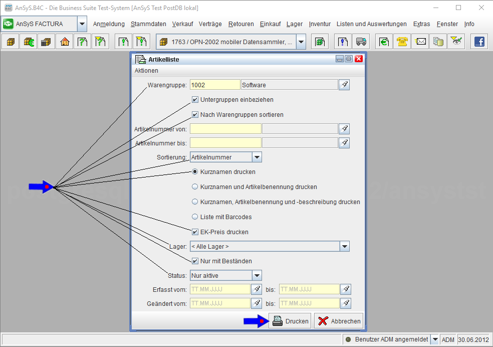 Nach den erfolgten Einstellungen den Button 'Drucken' betätigen und die Artikelliste wird anhand der eingestellten Kriterien erstellt.