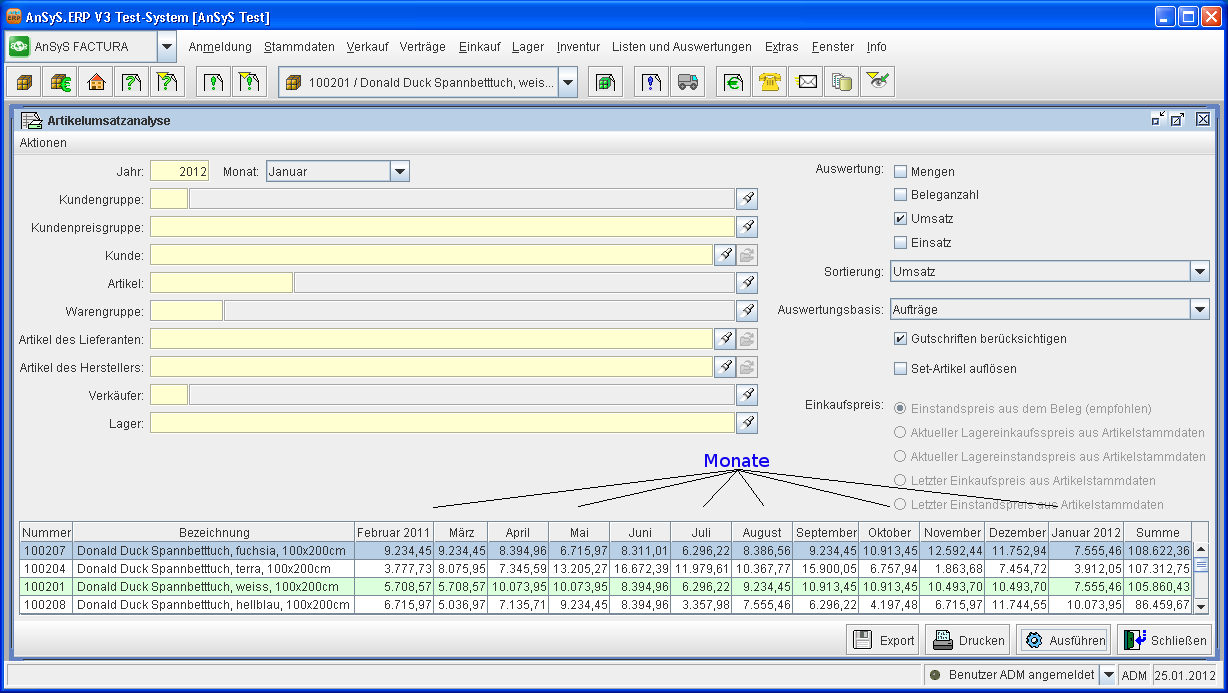 Nun sehen Sie von jedem verkauften Artikel die Umsatzzahlen pro Monat übersichtlich dargestellt.