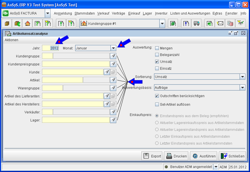 Kundenpreisgruppen: Im Prinzip wie bei den Kundengruppen. Nur sind hier noch viel detailliertere Informationen hinterlegt, was die Preisgestaltung angeht. Zur Auswertung der Artikelumsatzanalyse suchen Sie sich die Kundenpreisgruppe nach der Sie auswerten möchten aus und starten die Auswertung nach diesen Kriterium.