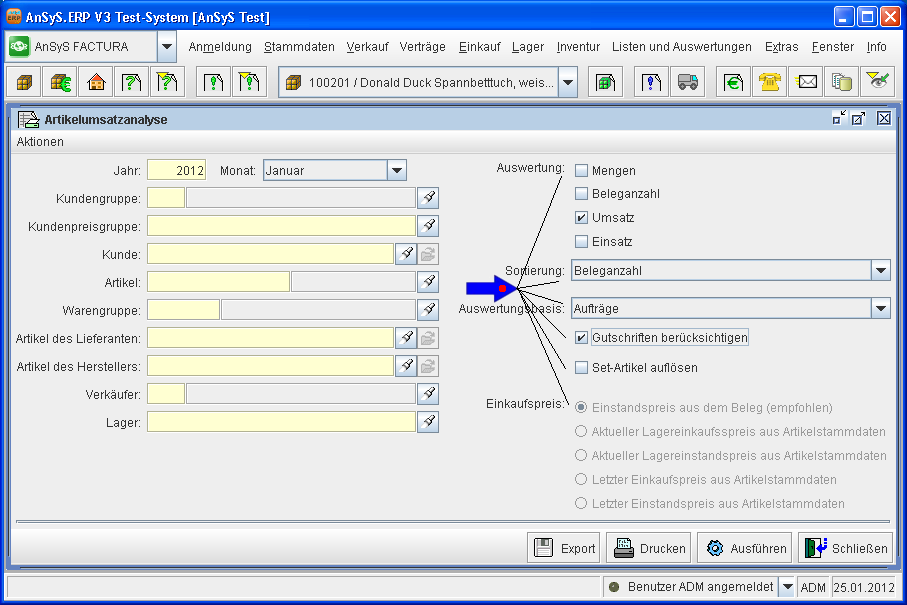 Set-Artikel auflösen: Sind in Ihren Stammdaten auch Set-Artikel angelegt, können Sie entscheiden, ob diese für die Auswertung als ganzes betrachtet werden sollen oder zerlegt in seine einzelnen Hauptbestandteile.