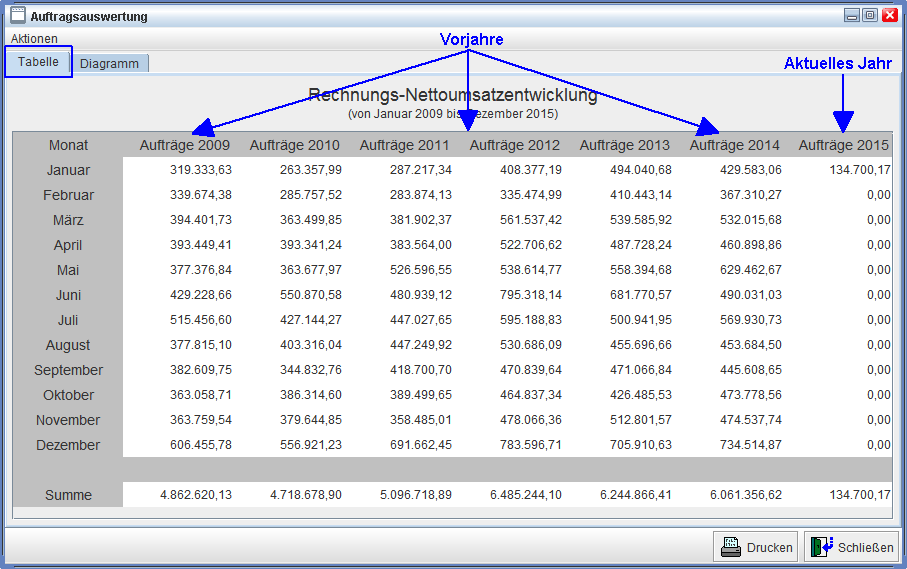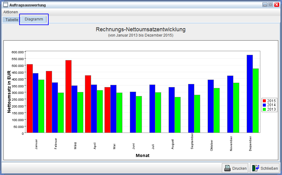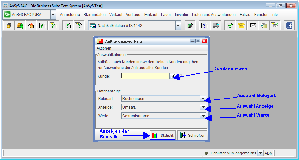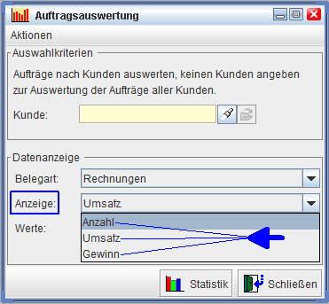 Hier können Sie eine Auftragsauswertung starten, die Sie sich, nach eingegebenen Daten, entweder als Tabelle oder als Diagramm zeigen lassen können.