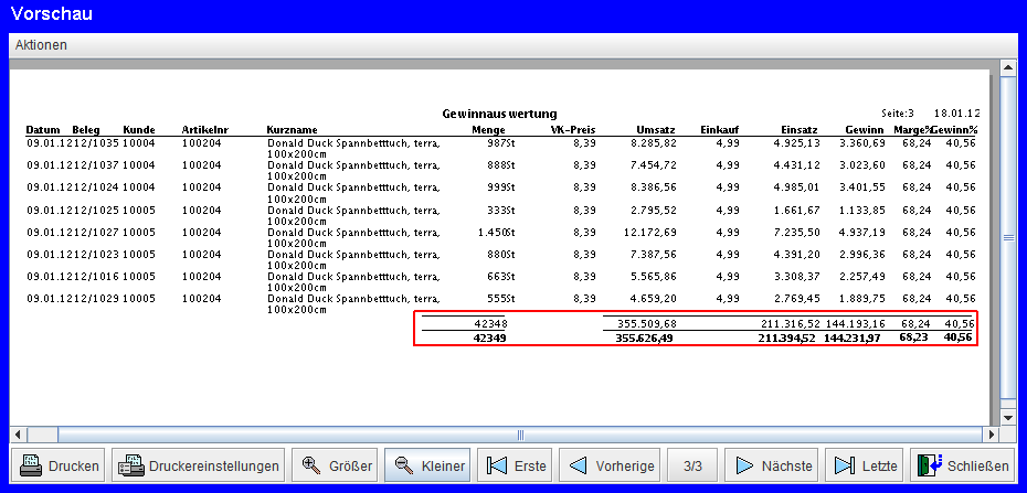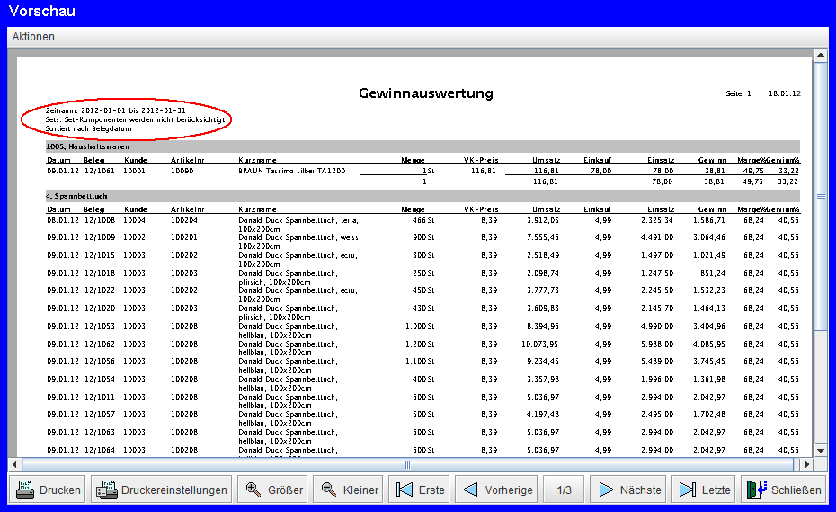 Ansonsten das Datum (Rechnungsdatum), die Belegnummer (Rechnungsnummer), den Kunden (Kundennummer), die Artikelnummer, den Kurznamen des Artikels und die verkaufte Menge. Die anderen Spaltenüberschriften wurden bereits oben bei 'Gewinn' erklärt.