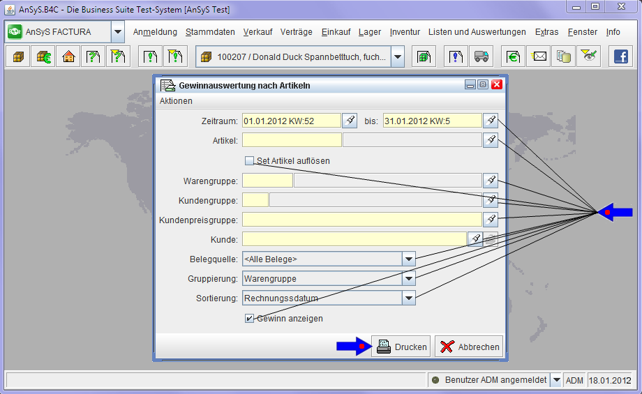 Artikel Bei Auswahl eines Artikels, werden nur die Verkäufe dieses einen Artikel angezeigt. Nehmen Sie keine Auswahl vor, werden alle Artikel ausgewertet und aufgelistet.