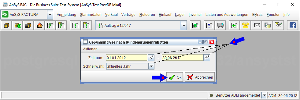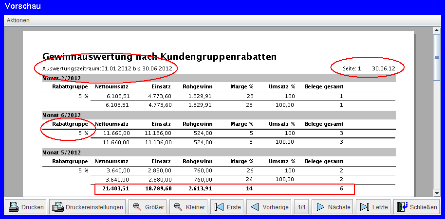 In unserem Testsystem haben wir exemplarisch eine Kundengruppe angelegt mit einem hinterlegten Auftragsrabatt von 5 %. Diese angelegte Kundengruppe wird hier in der Auswertung in den einzelnen Monatsblöcken als 'Rabattgruppe 5 %' wieder dargestellt.