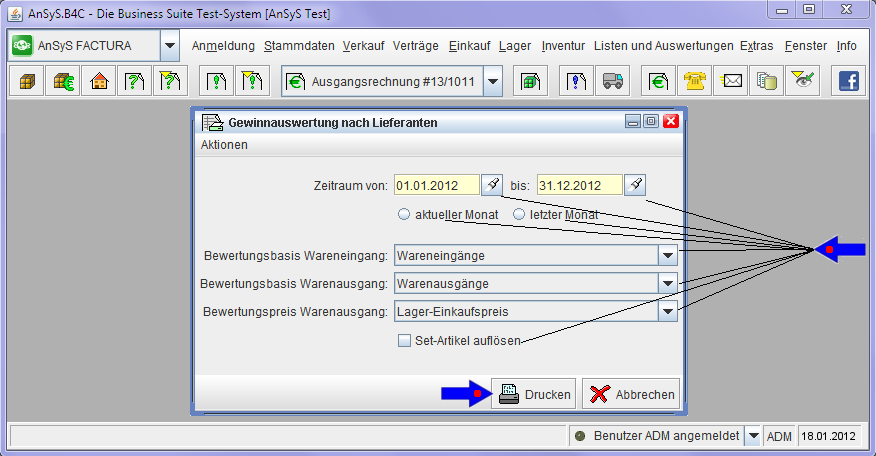 Jetzt kommen wir zu dem Feld 'Bewertungspreis Warenausgang'. Auch hier ist wieder die Selektion zwischen zwei Auswahlmöglichkeiten gegeben. Aber das hängt jetzt auch davon ab, welche Preisfelder Sie in den Artikelstammdaten pflegen. Als Selektionsmöglichkeit bieten sich hier 'Lager-Einstandspreis' und 'Lager-Einkaufpreis' an. Die hier ausgewählten Preise, spiegeln das Verhältnis des Gewinns auf unterschiedliche Weise in der Auswertung wieder. Das werden Sie dann noch genauer sehen, sobald Sie die Auswertung einmal durchgeführt haben. Als letztes müssen Sie sich noch überlegen, ob Sie ein Häkchen setzen bei 'Set-Artikel auflösen' oder nicht. Ein Set-Artikel kann z.B. eine Kamera sein, die Sie verkaufen. Diese besteht aus einem Kameragehäuse und einem Objektiv. Man spricht hier auch von einer Stückliste. Die Stückliste listet auf, aus welchen Artikeln (Teile) das Set besteht.In unserem Beispiel haben wir die 'Wareneingänge', 'Warenausgänge' und den 'Lagereinkaufspreis' gewählt. Das Häkchen bei 'Set-Artikel auflösen' haben wir hier nicht gesetzt.