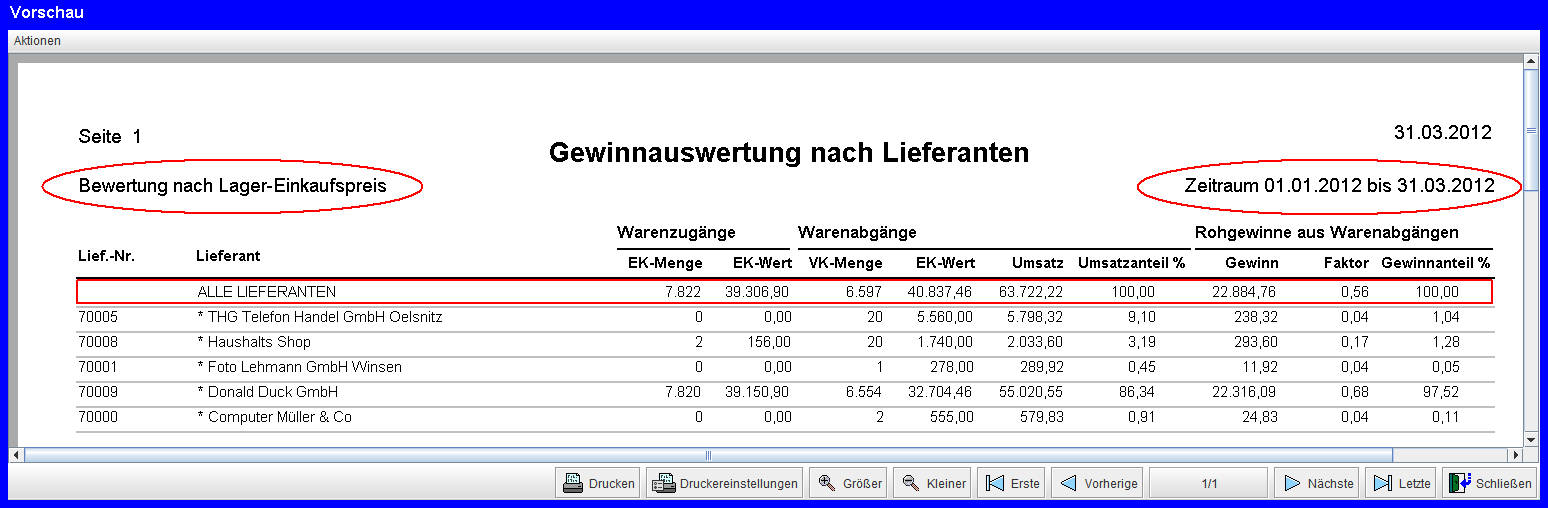 Diese Gewinnauswertung hilft Ihnen die Umsätze bei Ihren Lieferanten zu analysieren. Hier erhalten Sie schnell einen Überblick, bei welchem Lieferanten Sie die höchsten Umsätze erzielt haben.
