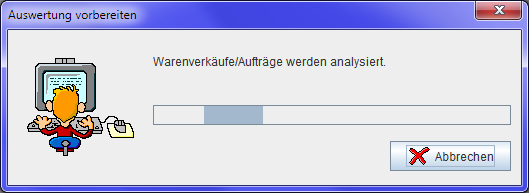 Wenn Sie alle Einstellungen vorgenommen haben, klicken Sie auf die Schaltfläche 'Drucken'. Nun sehen Sie einen kleinen Dialog mit Fortschrittsbalken, der signalisiert, das die Daten vorbereitet werden. Zuerst werden die Daten der Warenverkäufe und im Anschluss die der Kassenverkäufe analysiert. Je nach Datenvolumen, dauert es nun unter Umständen einen kleinen Moment. Dieser Dialog/Anzeige schließt sich automatisch, wenn die Analyse fertig ist.