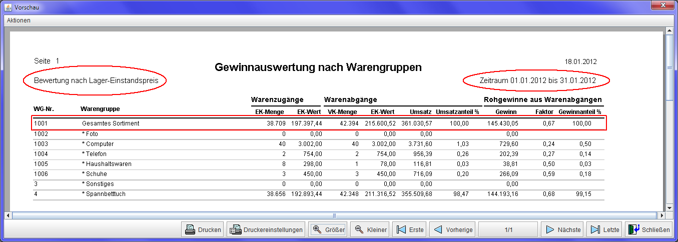 Eins sollte noch erwähnt werden. Die erste Zeile zeigt immer das Gesamtergebnis an. Darunter erscheinen dann die einzelnen Warengruppen. Summiert man diese auf, haben Sie genau die Info, die in der ersten Zeile als 'Gesamtergebnis' steht. In dieser Übersicht kann man sehr schön nachvollziehen, welche Warengruppen am meisten zu einem positiven betriebswirtschaftlichen Ergebnis beigetragen haben.
