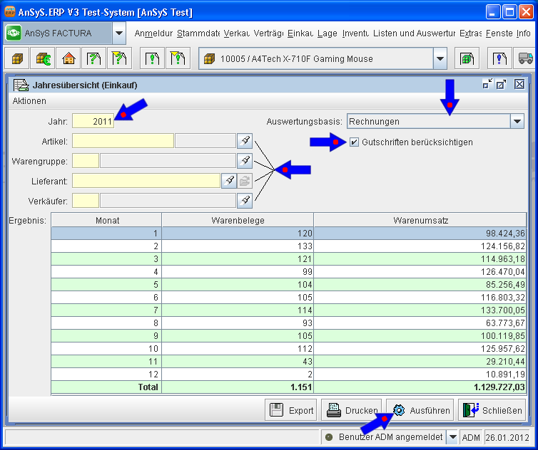 Als Auswertungsbasis für diese Jahresübersicht, können Sie die Rechnungen oder die Aufträge zugrunde legen.