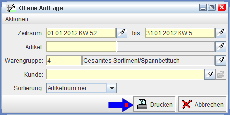 Zuerst wählen Sie einen Zeitraum aus. Wird hier kein Datum gesetzt, werden Ihnen alle 'Offenen Aufträge' aufgelistet. Das Gleiche wäre auch mit den Warengruppen möglich. Zuletzt haben Sie noch die Option, sich die Liste nach, Auftragsdatum, Artikelnummer, Kundenname und Kundennummer sortieren zu lassen. Folgend sehen Sie ein Beispiel, wie es aussehen könnte.