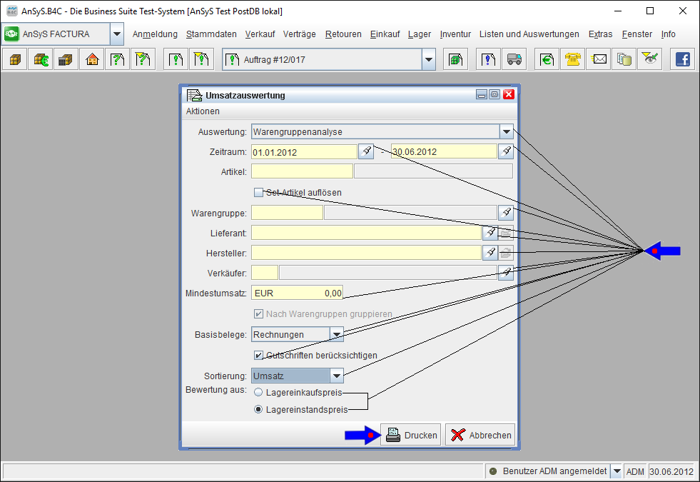 In unserem Screenshot können Sie jetzt sehen, das Sie keinen Artikel auswählen können (es fehlt die 'Taschenlampe' um den Suchdialog zu öffnen) und den ausgegrauten Schriftzug ' Nach Warengruppen gruppieren'. Nachdem die Einstellungen vorgenommen wurden, einfach auf den 'Drucken' Button klicken und die Auswertung wird erzeugt.