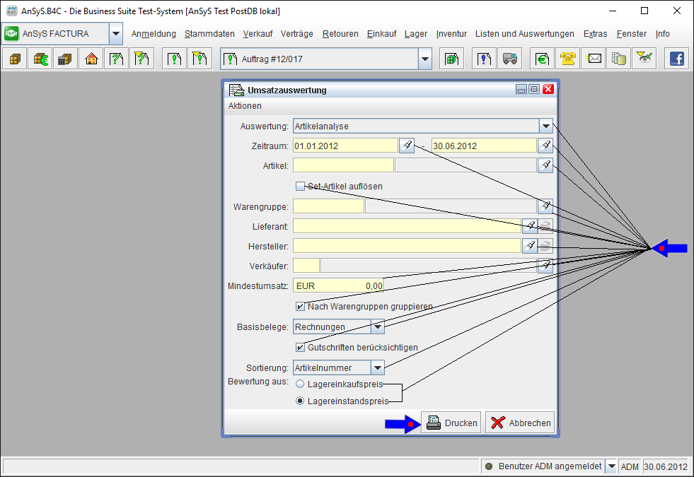 Danach stehen Sie im Eingabedialog dieser Auswertung. Anhand unseres Beispiels erklären wir Ihnen die einzelnen Eingabe- und Auswahlfelder nun etwas genauer:
