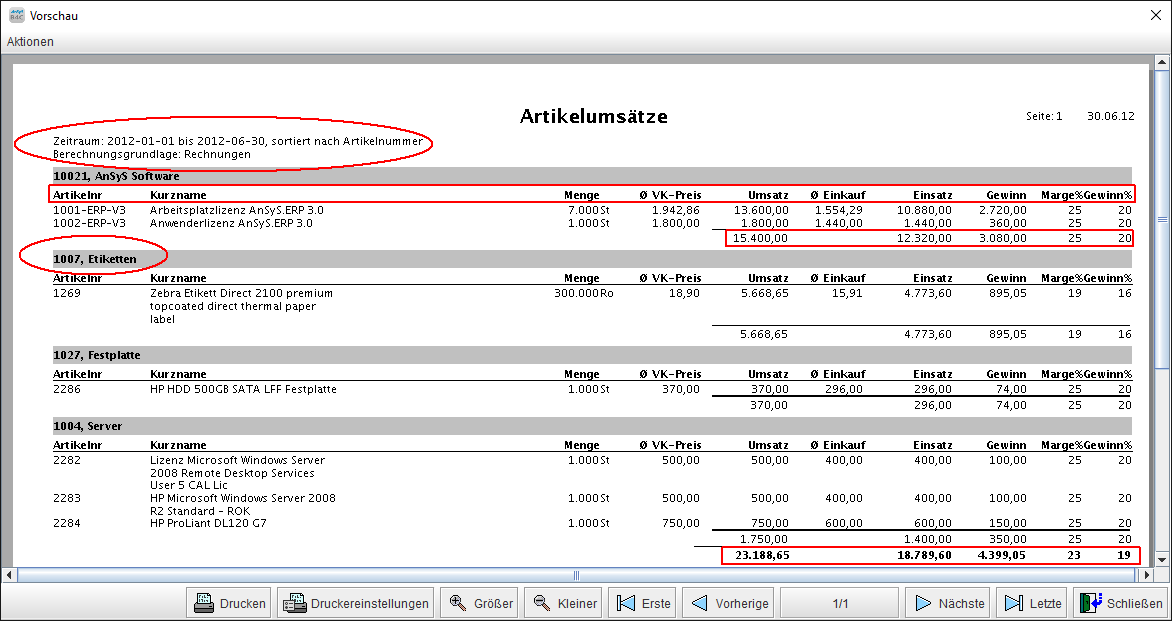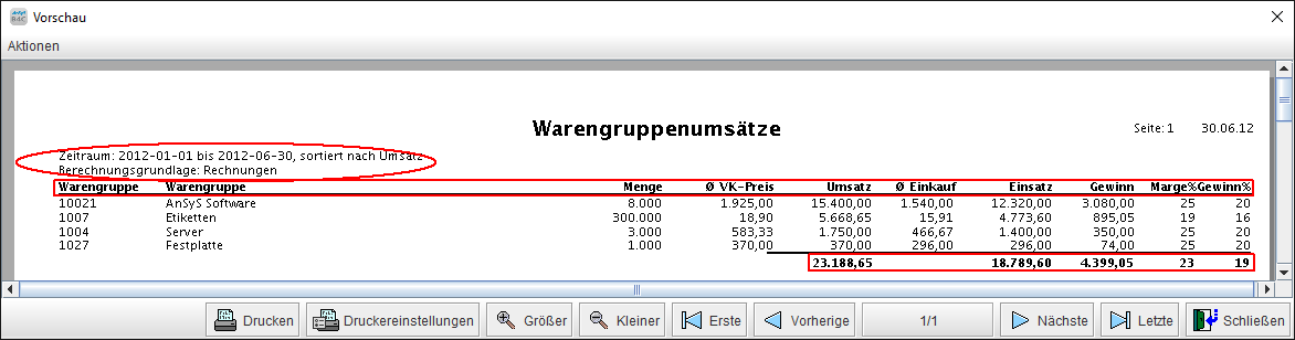 Des weiteren haben wir im Dialog gesagt, das nach Warengruppen gruppiert werden soll. Nach jeder Warengruppe (Bezeichnung im grauen Balken) sehen Sie nun so etwas wie Spaltenüberschriften (unter grauen Balken rot eingerahmt) mit den Bezeichnungen von links beginnend: Artikelnummer, Kurzname (des Artikels), Menge, Ø VK-Preis, Umsatz, Ø Einkauf, Einsatz, Gewinn, Marge% und Gewinn%. Ganz unten finden Sie noch einmal ein Gesamtergebnis, wo die Umsätze, Einsatz, Gewinn, Marge% und Gewinn% kumuliert werden bzw. ein Mittelwert angezeigt wird.