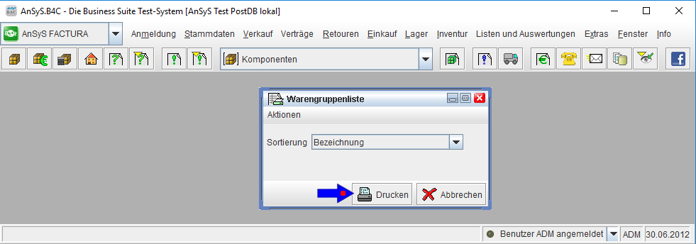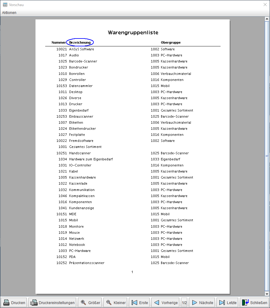 Nach dem betätigen der Schaltfläche 'Drucken' wird die Warengruppenliste erzeugt und auf dem Bildschirm angezeigt.