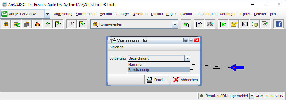 Auswahl der Sortierungsmöglichkeit nach 'Nummer' oder 'Bezeichnung'. In unserem Beispiel haben wir die 'Bezeichnung' gewählt.