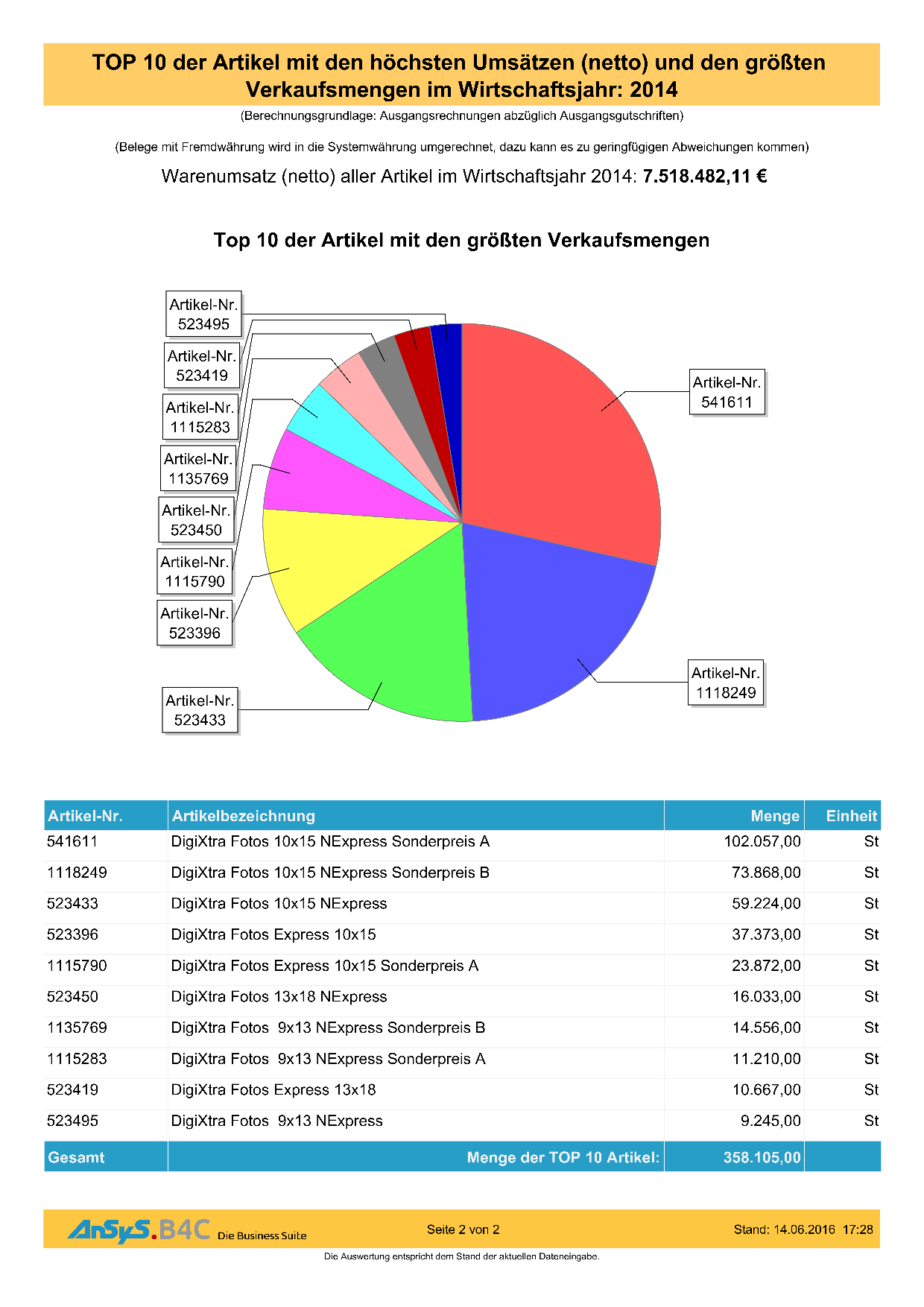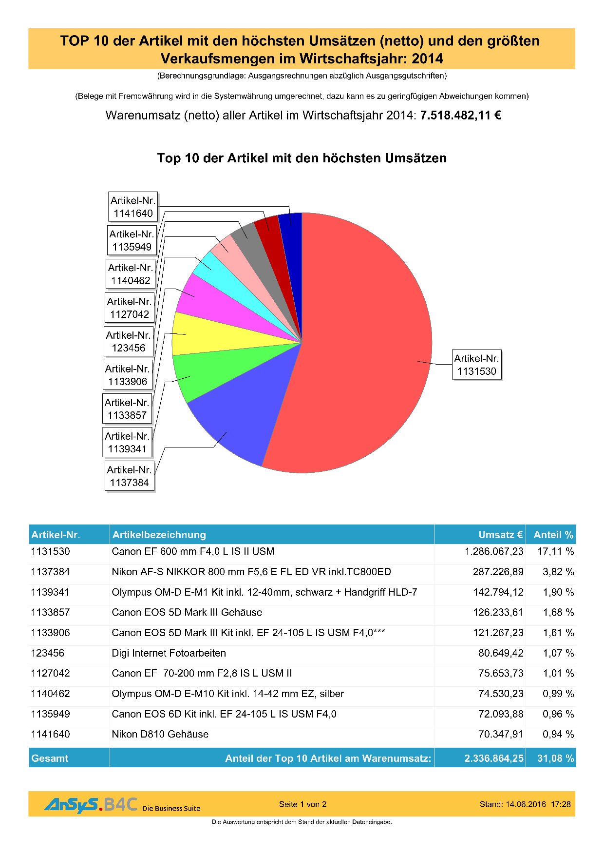 Ein Mausklick auf die Schaltfläche 'Report erzeugen' und die Ergebnisse werden Ihnen geliefert.Zuerst die Seite mit den Top 10 der umsatzstärksten Artikel unseres Musterreports: