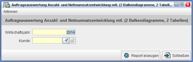 Wie Sie schon der Überschrift entnehmen können, werden in diesem Report zum einen die Anzahl der Aufträge und zum anderen die Umsätze aus den Aufträgen ausgewertet. Diese Auswertung wird umso interessanter, wenn schon Vergleichsjahre vorhanden sind. Man gibt wiederum das Wirtschaftsjahr ein und es werden die letzten 5 Jahre + Eingabejahr monatlich ausgewertet – also maximal 6 Jahre im Report. Es besteht sogar die Möglichkeit ganz gezielt einen Kunden einzugeben, wenn man das möchte. Wenn das Kundenfeld leer bleibt, werden alle nicht stornierten Aufträge mit herangezogen von allen Kunden im gewählten Wirtschaftsjahr und 5 Jahre davor.