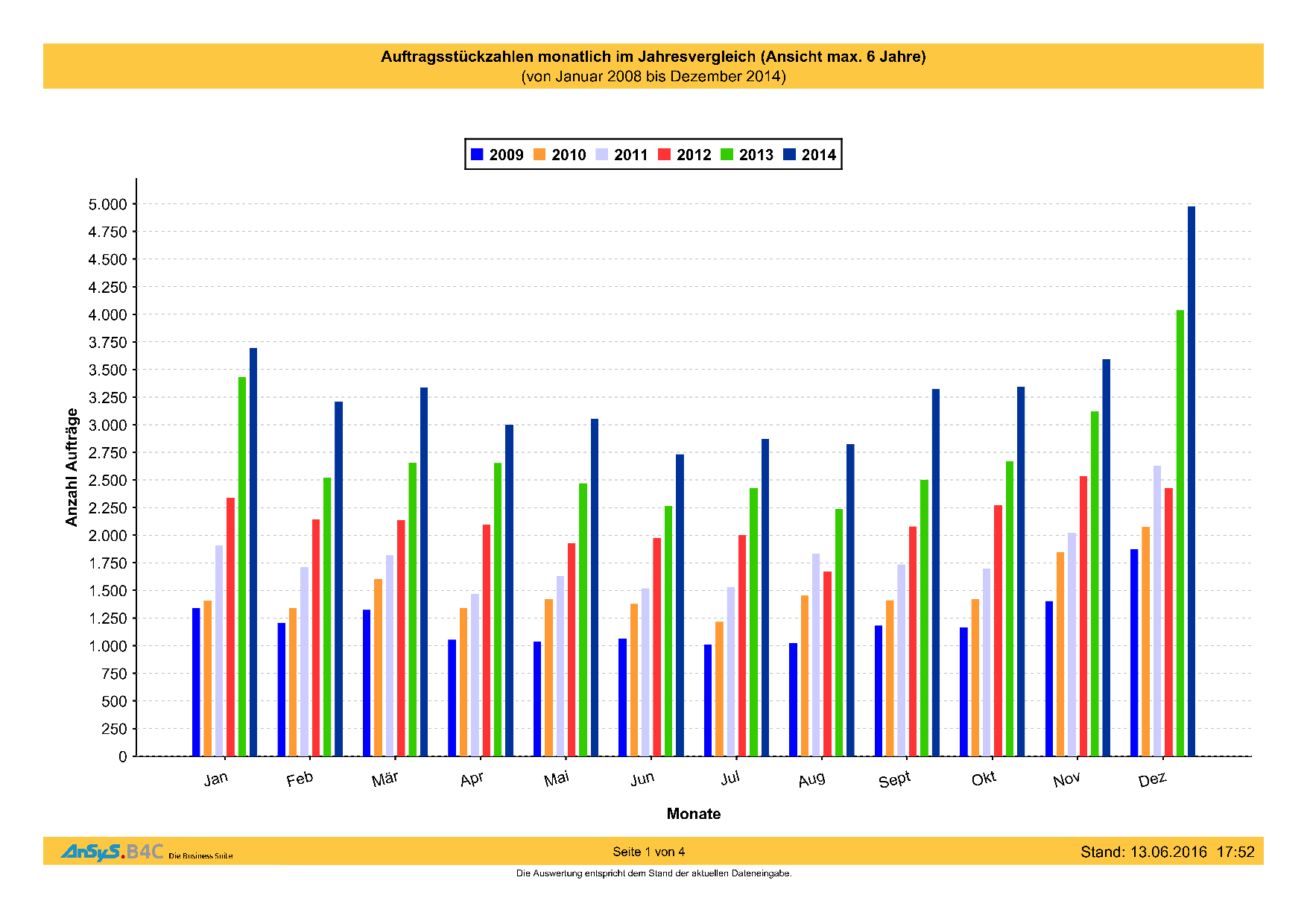 In unserem Beispieldiagramm sehen Sie die Jahre pro Monat rückwirkend ab 2014. Man kann sehr schön sehen, das die Anzahl der Aufträge kontinuierlich Monat für Monat und Jahr für Jahr gestiegen sind, so wie man es als Unternehmer gerne sieht und sich wünscht.
