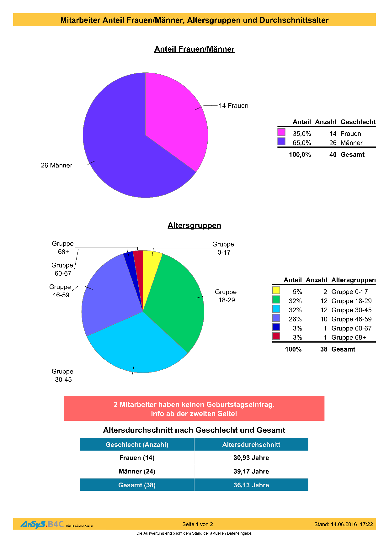 Hier werden Ihnen nun die Daten übersichtlich präsentiert. So behalten Sie immer den Überblick bezüglich den Frauen-/Männeranteil und der Altersstruktur in Ihrem Betrieb.Sollte bei einem Mitarbeiter kein Geburtstag eingetragen sein, werden Sie darüber im Report informiert. Einmal visuell gleich auf der ersten Seite und dann noch einmal in einer Liste, wo die Namen aufgeführt sind die es betrifft.
