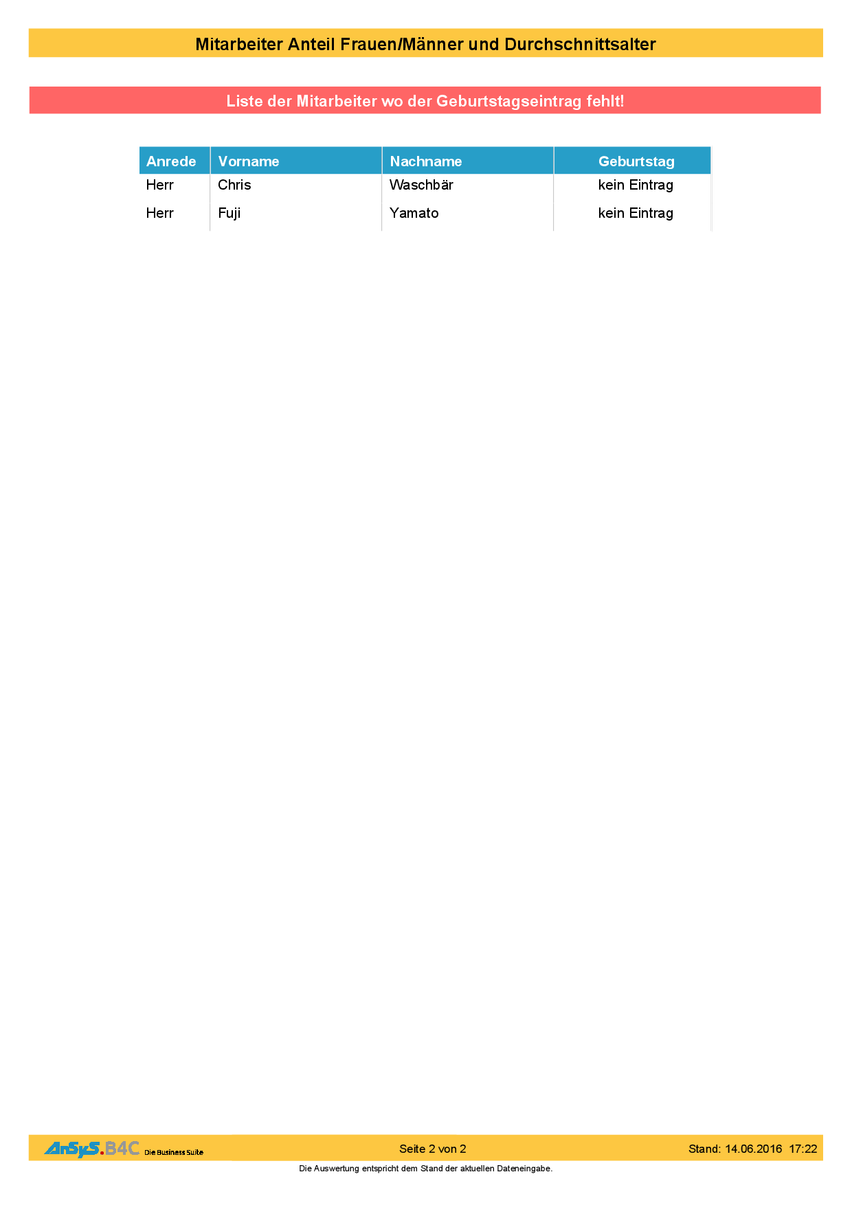 Fehlt bei Mitarbeitern das Geburtstag in den Stammdaten, bekommen Sie einen Hinweis dazu auf der ersten Seite des Reports und auf der zweiten Seite eine Auflistung derer die es betrifft.