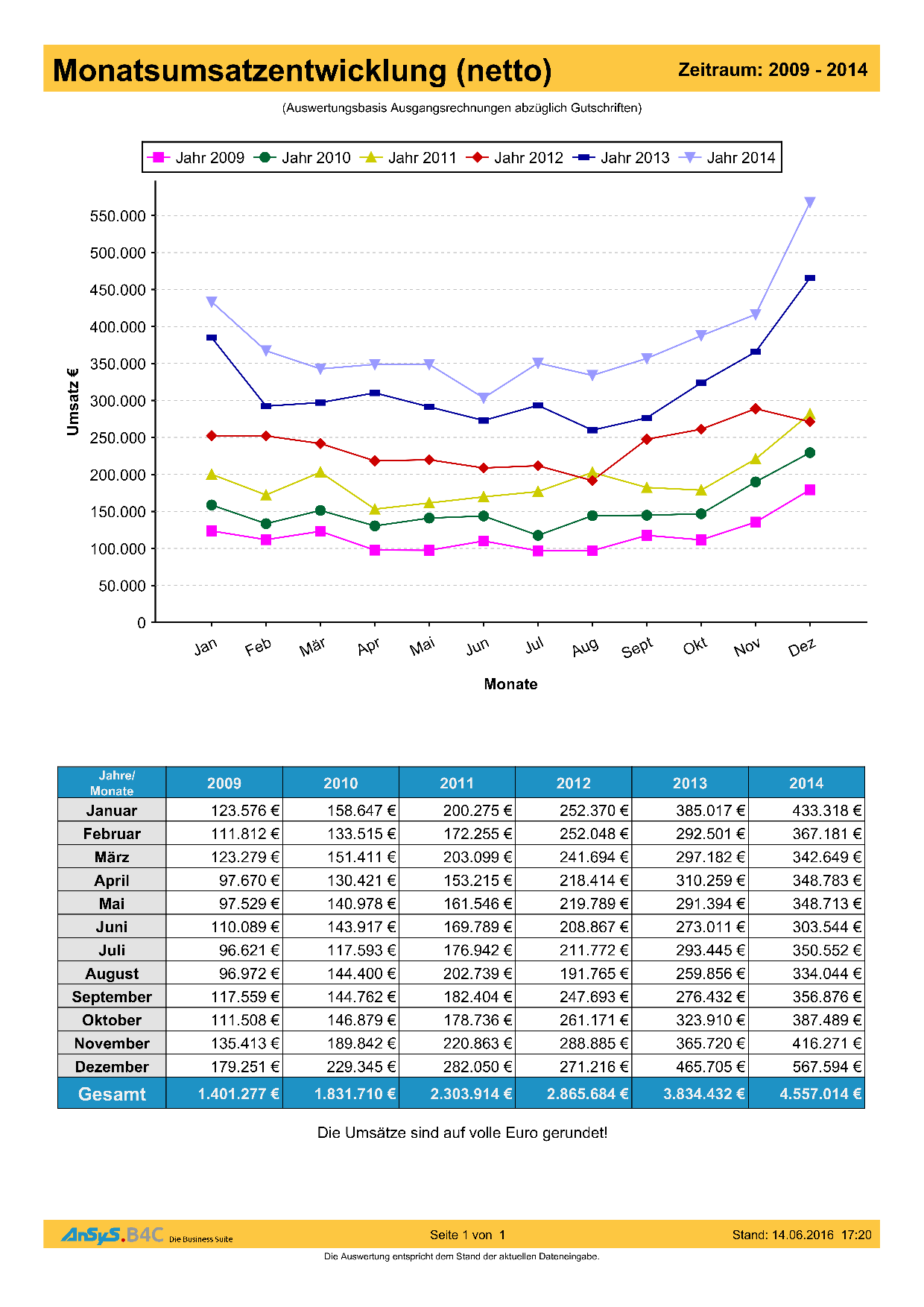 Auch in diesem Musterreport kann man sehr schön beobachten, das die Umsätze jährlich ansteigen und eine positive Entwicklung zeigen.