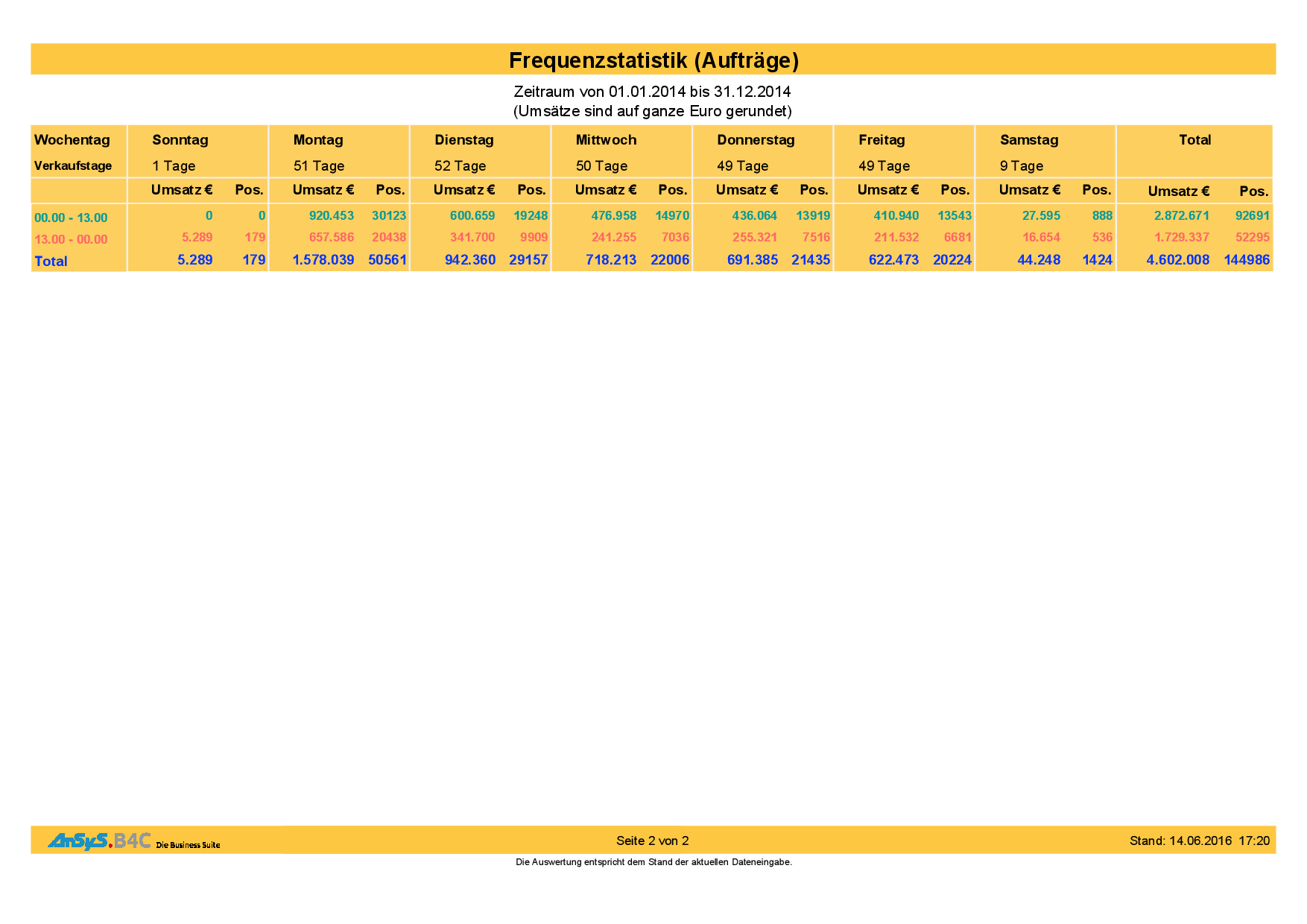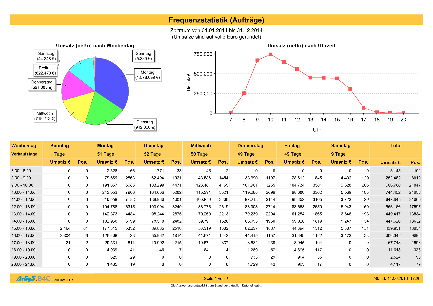 Kurzum: Ihnen wird mitgeteilt an welchen Tagen zu welchen Zeiten Umsätze generiert wurden. Das kann z.B. für die Personalplanung ganz wichtig sein, um Stoßzeiten in der Auftragserfassung/Auftragsbearbeitung abfangen zu können.