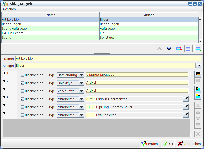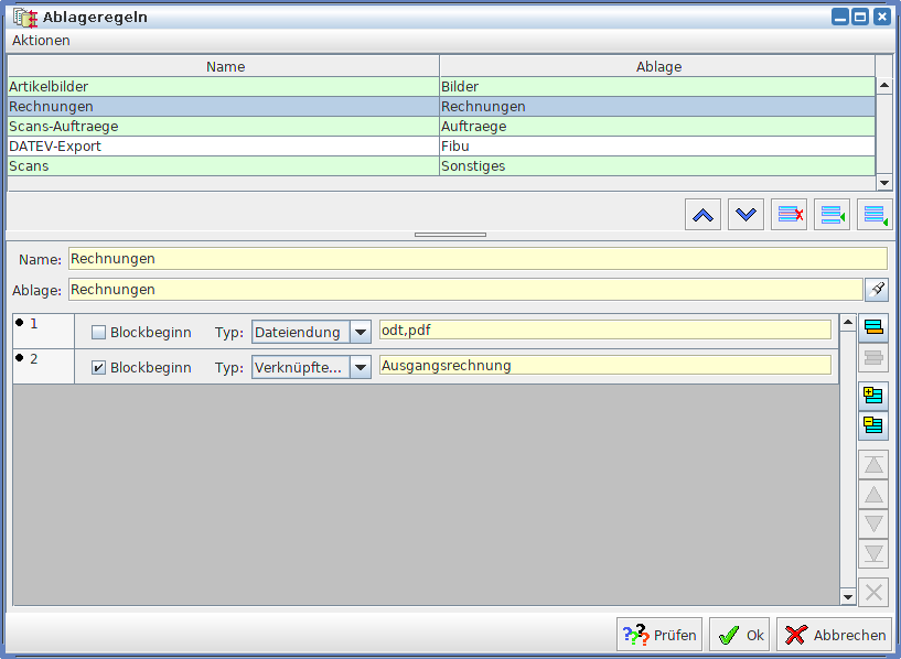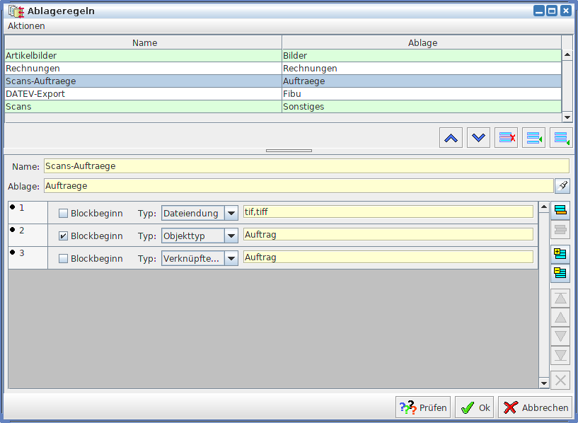 Ein Block beginnt mit dem Prüfkriterium, bei welchem das Feld „Blockbeginn“ markiert ist. Alle nachfolgenden Kriterien bei denen das Feld „Blockbeginn“ nicht markiert ist, gehören zu dem Block. Der erste Block der Ablageregel ist impliziert definiert. Das bedeutet, dass das Feld „Blockbeginn“ für das erste Prüfkriterium immer als markiert angesehen wird.