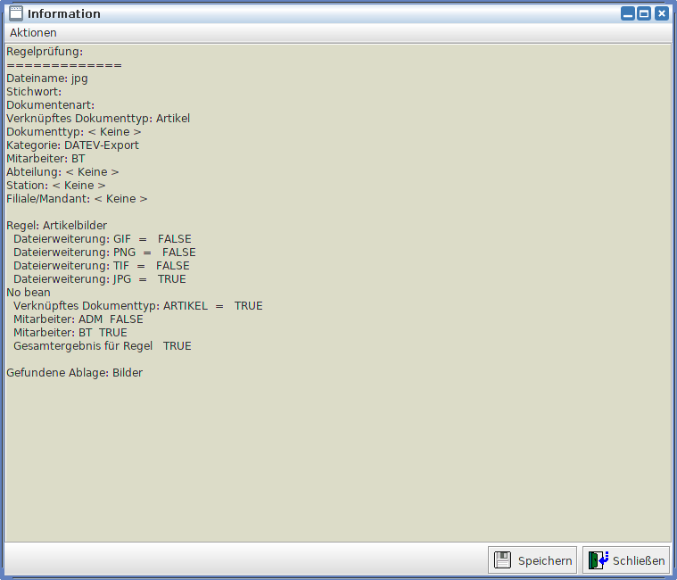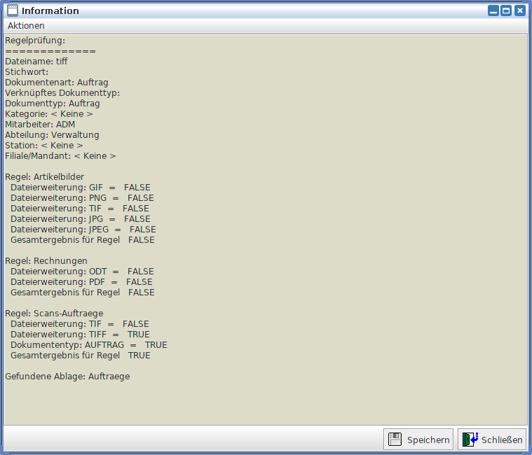 Am Ende wird ausgewertet, ob alle Blöcke den Wert WAHR liefern. Dann wurde für die Ablageregel ein positives Ergebnis ermittelt.