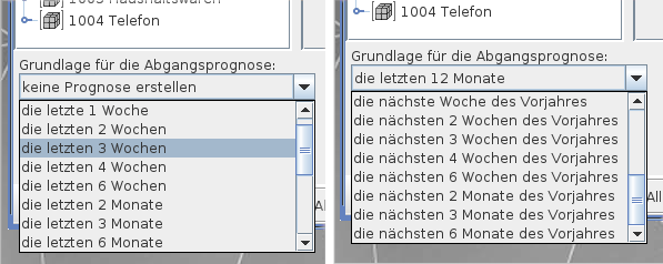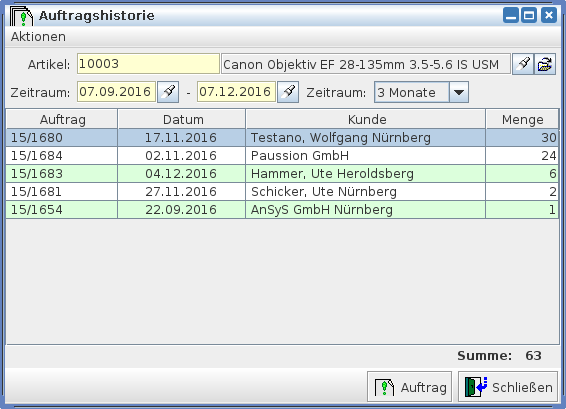 Eine weitere wichtige Schaltfläche bei diesem Dialog ist [Auftragshistorie]. Hier können Sie bei einem einzelnen Artikel wann dieser schon einmal bestellt wurde und wie oft. Dafür können Sie eine Zeitspanne eingeben. Sie können entweder per Hand ein Startdatum eintragen oder über die die vorgegeben Zeiträume. Hier haben Sie die folgenden Möglichkeiten: