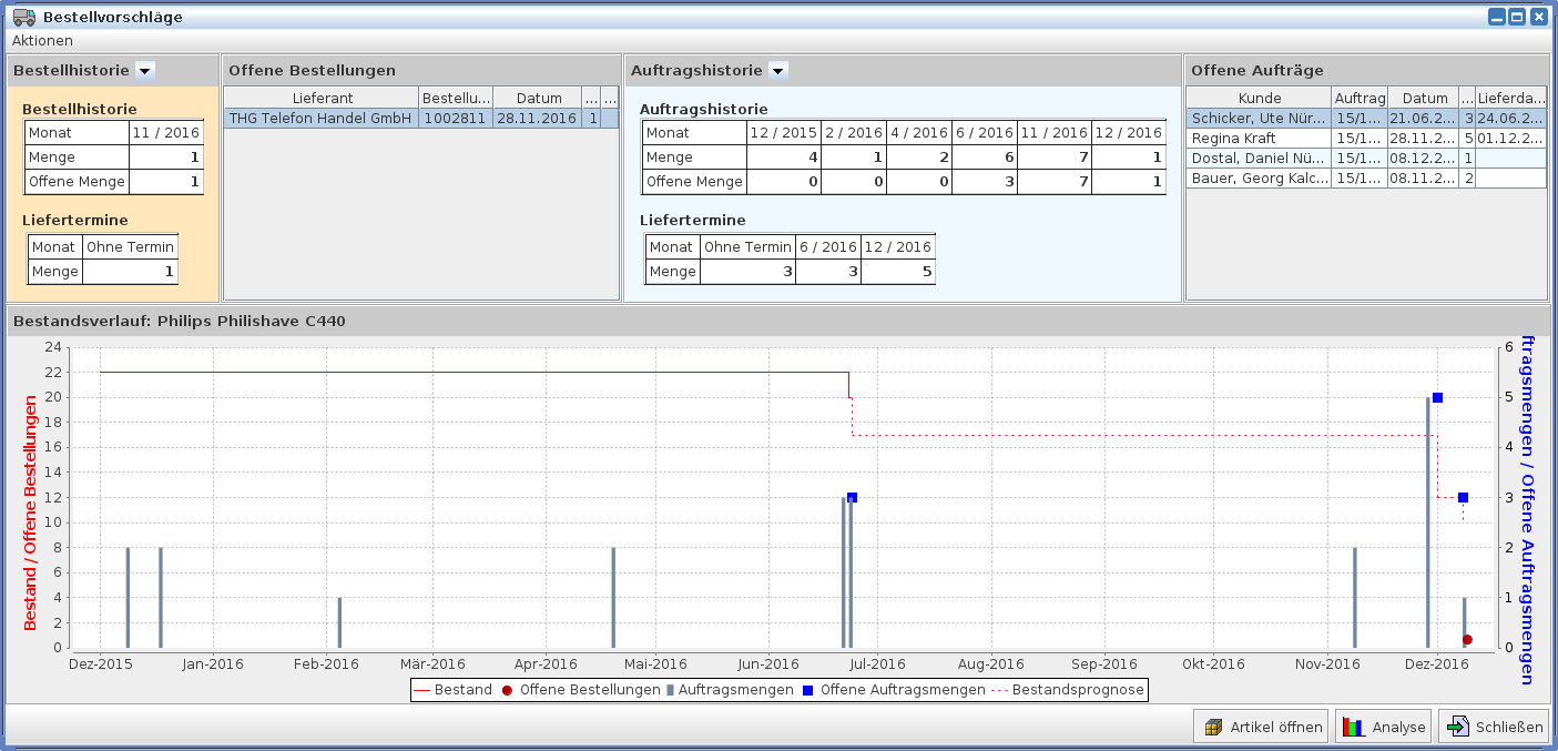 Wie schon im Artikel Bestellvorschläge erwähnt erhält man in der Übersicht im Dialog der Bestellvorschläge unten rechts eine kleine Anzeige des Bestandsverlaufes. Über die Schaltfläche [Analyse] werden Ihnen noch viele weitere Informationen zu diesem Artikel gegeben.