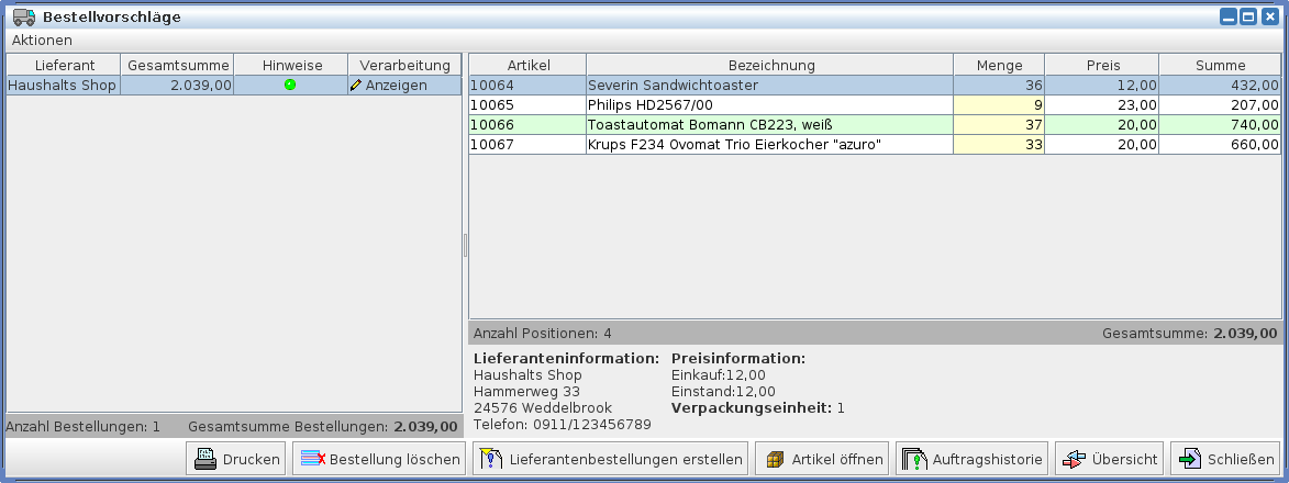 Man kann falls die Bestellung doch nicht mehr notwendig ist, diese natürlich auch wieder über die Schaltfläche [Bestellung löschen] wieder löschen. Klickt man auf [Lieferantenbestellung erstellen] erscheint auch hier je nachdem welche Verarbeitungseinstellung man eben eingetragen hat, die Druckvorschau, der Dialog zur Lieferantenbestellung oder eben wieder die Übersicht der Bestellvorschläge.