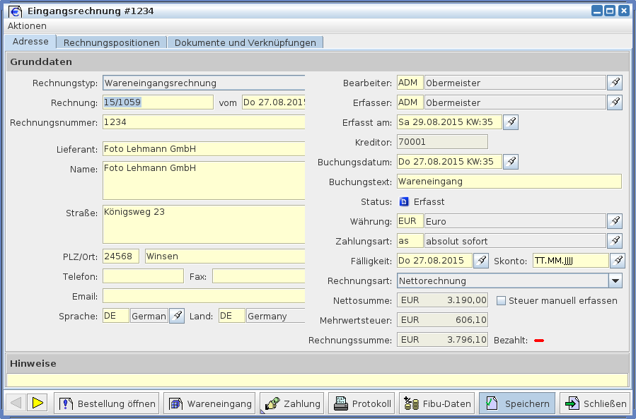Eingangsrechnungen werden in drei Karteikarten erfasst. Die Karteikarte „Adresse“ erfasst die Kopfdaten der Rechnung wie Lieferantenangaben.
