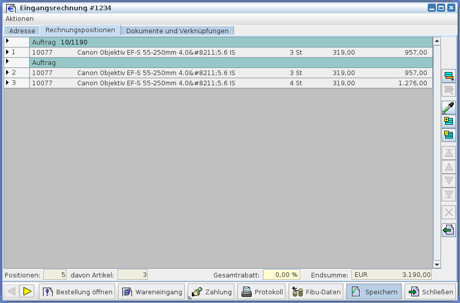 Die Karteikarte „Rechnungspositionen“ enthält die Positionen der Eingangsrechnung in Listenform.