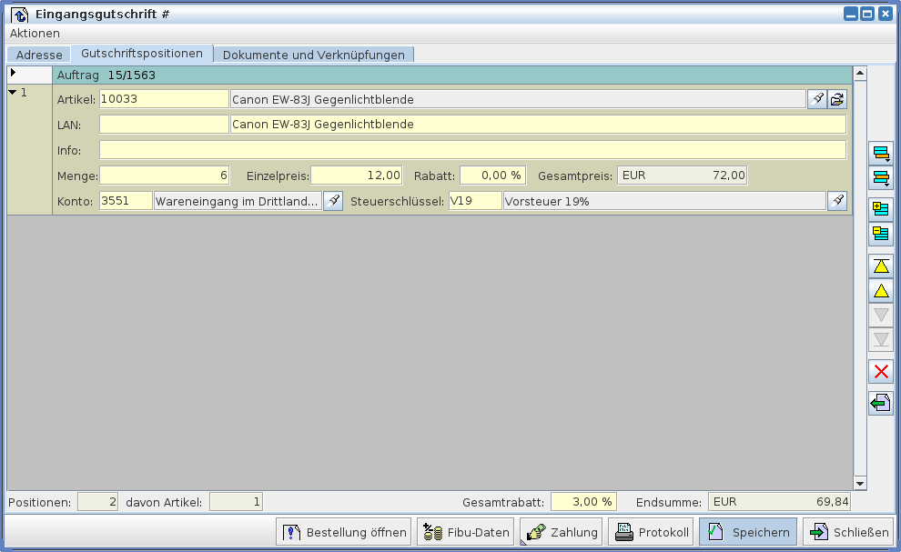 Sind alle Kopfdaten auf der Karteikarte „Adresse“ als korrekt verifiziert, kann auf die Karteikarte „Gutschriftspositionen“ gewechselt werden.