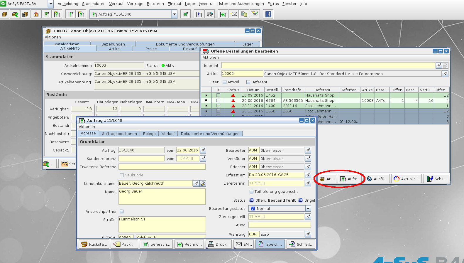 Markiert man einen Artikel aus einer Bestellung kann man sich die Artikel-Info über die Schaltfläche [Artikel] ganz einfach anzeigen lassen. Weitere Informationen zu den Artikeldaten finden Sie hier. Weiterhin kann man dadurch bei Klicken auf die Schaltfläche [Aufträge] sich die Aufträge dazu anzeigen lassen. Weitere Informationen zu Aufträgen finden Sie hier.